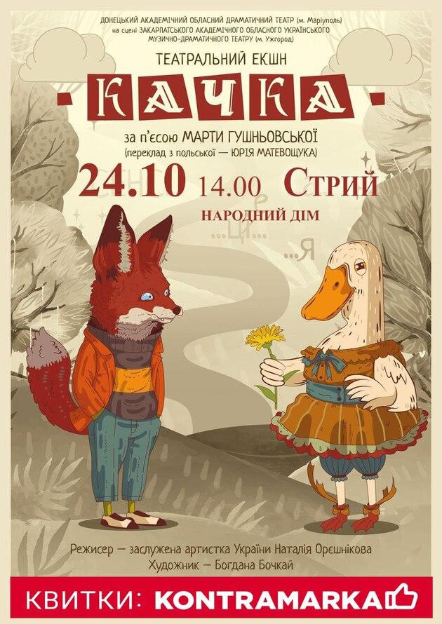 24 жовтня о 14-00 запрошуємо жителів міста Стрия на виставу «Качка» — веселу і красиву постановку для всієї родини.