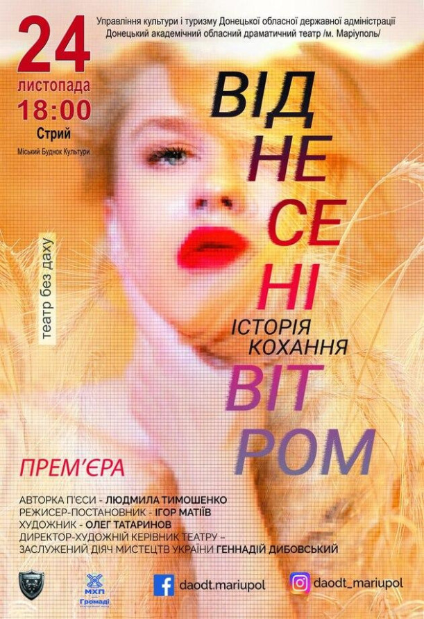 Незламний театр Маріуполя, що вистояв і не втратив духу, представляє сучасну постановку культової історії "Віднесені вітром"( за п'єсою сучасної української драматургині Людмили Тимошенко, що є інтерпретацією всесвітньо відомого роману Маргарет Мітчелл).